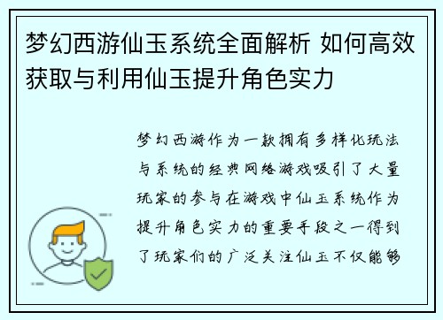 《御龙在天》是一款深受玩家喜爱的多人在线角色扮演游戏,其中弓箭手作为一大职业类型,以其远程攻击和高爆发伤害在战斗中占有重要地位。然而,要充分发挥弓箭手的优势,提升其战力和战斗表现,合理的加点方案显得尤为重要。本文将围绕“御龙在天弓箭加点攻略解析 如何提升弓箭手战力和战斗表现”这一话题,详细介绍弓箭手...